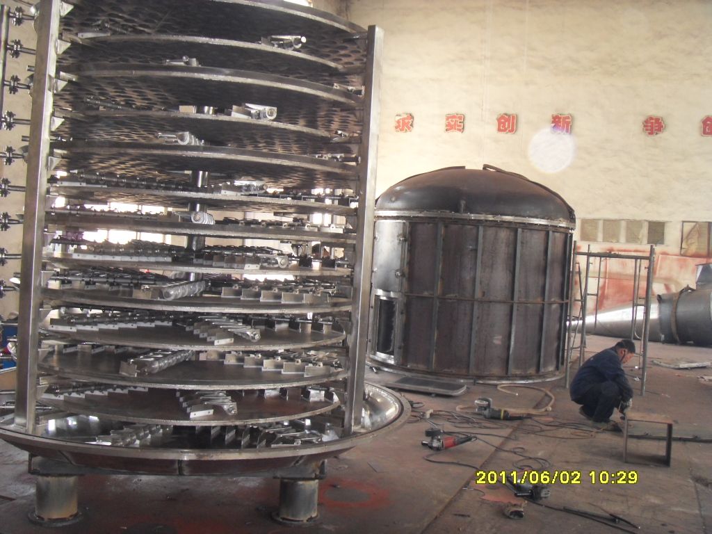 濕物料自加料器連續(xù)地加到干燥器上部干燥盤上,帶有耙葉的耙臂作回轉(zhuǎn)運(yùn)動使耙臂作回轉(zhuǎn)運(yùn)動使耙葉連續(xù)地翻抄物料。物料沿指數(shù)螺旋線流過干燥盤表面,在小干燥盤上的物料被移送到外緣,并在外緣落到下方的大干燥盤外緣,在大干盤上物料向里移動并從中間落料口落如下一層小干燥盤中。大小干燥盤上下交替排列,物料得以連續(xù)地流過整個干燥器。中空的干燥盤內(nèi)通入加熱介質(zhì),加熱介質(zhì)形式有飽和蒸汽、熱水和導(dǎo)熱油,加熱介質(zhì)由干燥盤的一端進(jìn)入,從另一端導(dǎo)出。已干物料從后一層干燥盤落到殼體的底層,后被耙葉移送到出料口排出。濕份從物料中逸出,由設(shè)在頂蓋上的排濕口排出,真空型盤式干燥器的濕氣由設(shè)在頂蓋上的真空泵口排出。從底層排出的干物料可直接包裝。通過配加翅片加熱器、溶劑回收冷凝器、袋式除塵器、干料返混機(jī)構(gòu)、引風(fēng)機(jī)等輔機(jī),可提高其干燥的生產(chǎn)能力,干燥膏糊狀和熱敏性物 料,可方便地回收溶劑,并能進(jìn)行熱解和反應(yīng)操作。