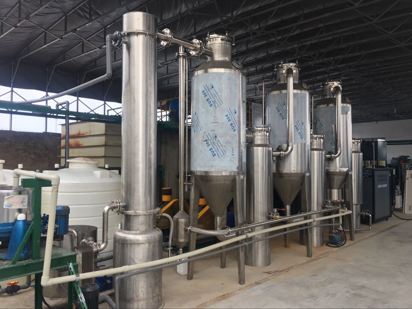 雙效蒸發(fā)器簡單的說就是兩個單效蒸發(fā)器串聯(lián)在一起,串聯(lián)的方式又分為并流、逆流、平流三種形式。加熱蒸發(fā)器、分離器、冷凝器、熱壓泵、保溫管、真空系統(tǒng)、料液輸送泵、冷凝排水泵、操作平臺、電器儀表控制柜及閥門、管路等系統(tǒng)組成。