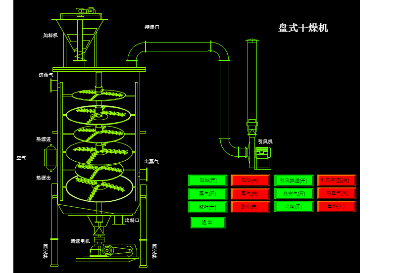 濕物料自加料器連續(xù)地加到干燥器上部干燥盤上,帶有耙葉的耙臂作回轉(zhuǎn)運(yùn)動(dòng)使耙臂作回轉(zhuǎn)運(yùn)動(dòng)使耙葉連續(xù)地翻抄物料。物料沿指數(shù)螺旋線流過干燥盤表面,在小干燥盤上的物料被移送到外緣,并在外緣落到下方的大干燥盤外緣,在大干盤上物料向里移動(dòng)并從中間落料口落如下一層小干燥盤中。大小干燥盤上下交替排列,物料得以連續(xù)地流過整個(gè)干燥器。中空的干燥盤內(nèi)通入加熱介質(zhì),加熱介質(zhì)形式有飽和蒸汽、熱水和導(dǎo)熱油,加熱介質(zhì)由干燥盤的一端進(jìn)入,從另一端導(dǎo)出。已干物料從后一層干燥盤落到殼體的底層,后被耙葉移送到出料口排出。濕份從物料中逸出,由設(shè)在頂蓋上的排濕口排出,真空型盤式干燥器的濕氣由設(shè)在頂蓋上的真空泵口排出。從底層排出的干物料可直接包裝。通過配加翅片加熱器、溶劑回收冷凝器、袋式除塵器、干料返混機(jī)構(gòu)、引風(fēng)機(jī)等輔機(jī),可提高其干燥的生產(chǎn)能力,干燥膏糊狀和熱敏性物 料,可方便地回收溶劑,并能進(jìn)行熱解和反應(yīng)操作。