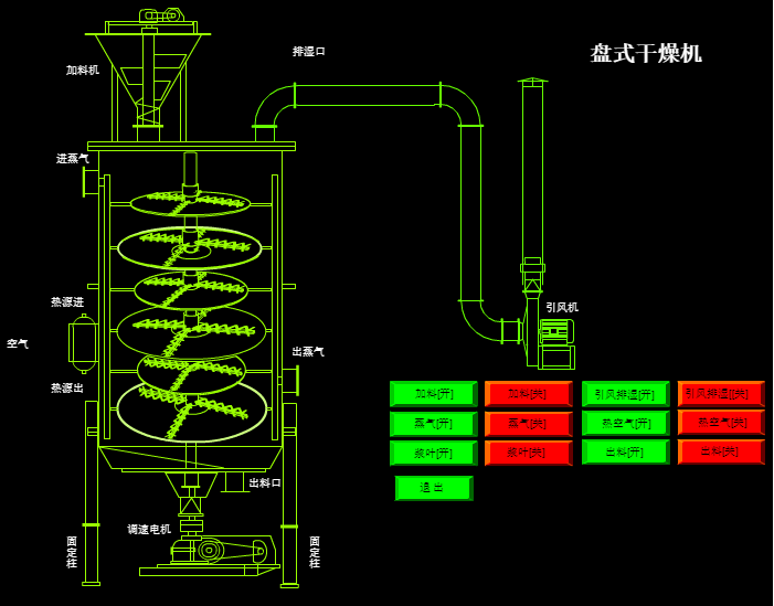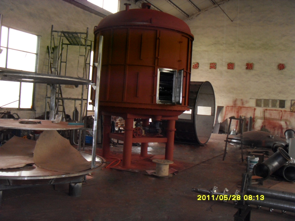 濕物料自加料器連續(xù)地加到干燥器上部干燥盤上,帶有耙葉的耙臂作回轉(zhuǎn)運(yùn)動(dòng)使耙臂作回轉(zhuǎn)運(yùn)動(dòng)使耙葉連續(xù)地翻抄物料。物料沿指數(shù)螺旋線流過(guò)干燥盤表面,在小干燥盤上的物料被移送到外緣,并在外緣落到下方的大干燥盤外緣,在大干盤上物料向里移動(dòng)并從中間落料口落如下一層小干燥盤中。大小干燥盤上下交替排列,物料得以連續(xù)地流過(guò)整個(gè)干燥器。中空的干燥盤內(nèi)通入加熱介質(zhì),加熱介質(zhì)形式有飽和蒸汽、熱水和導(dǎo)熱油,加熱介質(zhì)由干燥盤的一端進(jìn)入,從另一端導(dǎo)出。已干物料從后一層干燥盤落到殼體的底層,后被耙葉移送到出料口排出。濕份從物料中逸出,由設(shè)在頂蓋上的排濕口排出,真空型盤式干燥器的濕氣由設(shè)在頂蓋上的真空泵口排出。從底層排出的干物料可直接包裝。通過(guò)配加翅片加熱器、溶劑回收冷凝器、袋式除塵器、干料返混機(jī)構(gòu)、引風(fēng)機(jī)等輔機(jī),可提高其干燥的生產(chǎn)能力,干燥膏糊狀和熱敏性物 料,可方便地回收溶劑,并能進(jìn)行熱解和反應(yīng)操作。